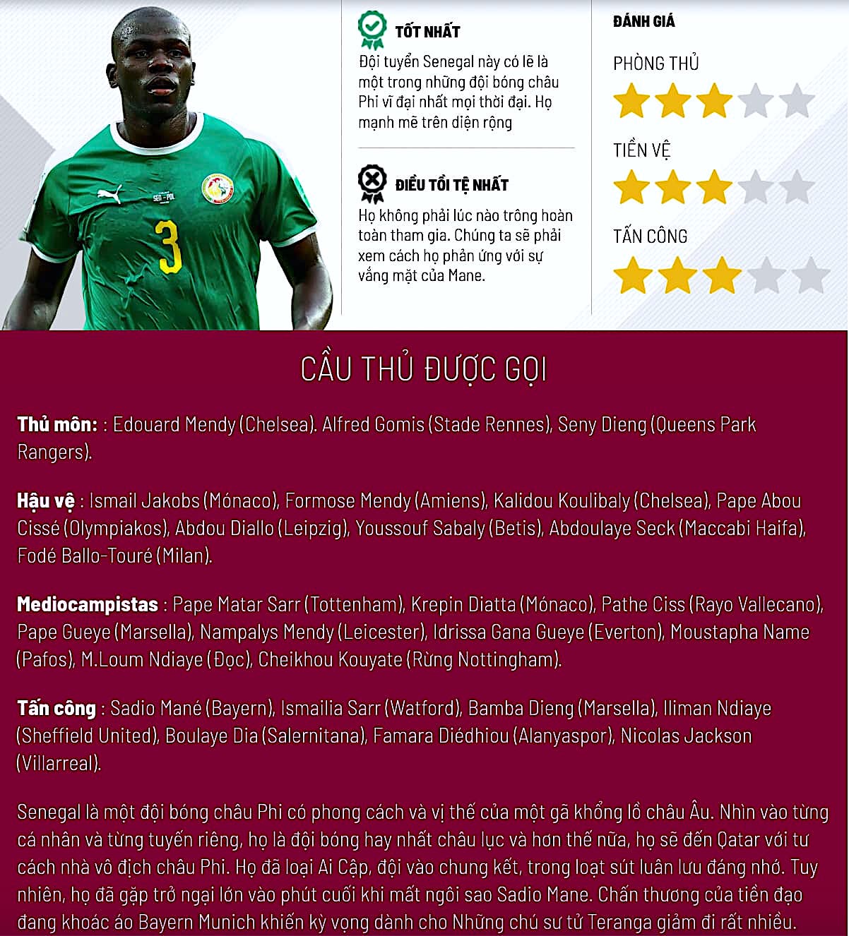 Cách đây 20 năm, ĐT Senegal lần đầu tham dự World Cup và ngay lập tức tạo nên ‘cơn địa chấn’. Họ đánh bại đội chủ nhà Pháp ngay trong trận ra quân và tiến vào đến vòng Tứ kết. Sau đó, Senegal lại vắng bóng ở World Cup và chỉ có thể trở lại vào năm 2018. Ở thời điểm hiện tại Senegal đang là nhà ĐKVĐ của AFCON – Cúp bóng đá Châu Phi. Với việc được xếp vào bảng A cùng với chủ nhà Qatar, Ecuador và Hà Lan.